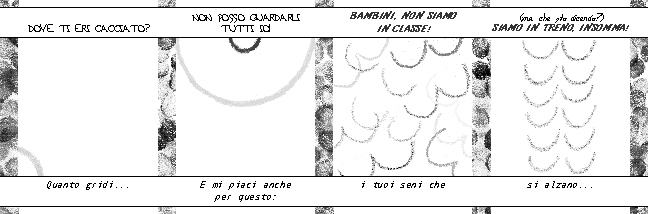 Con un segno morbidamente essenziale e geometrico, è ricerca grafica, umoristica e senza limiti (ottonari in rima baciata compresi, alla maniera del primo Corriere dei Piccoli). Qui la prima delle sei vignette.